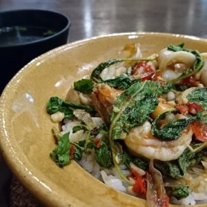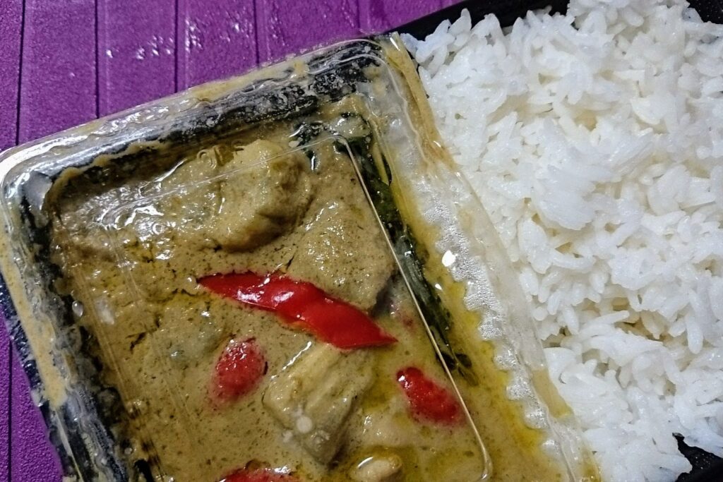 現地タイでは、レストランで食べるよりも、ぶっかけ食堂で選ぶとか、持ち帰るとかの方が多いかもしれません。 どこのお店だったか忘れましたが、この弁当、 プラスチックの容器に収まっていても、その表面にはしっかりと「正解」の油が浮いています。妥協のないというか、その場で作るというより作り置きする料理なので、弁当に向いてますね。もう、見るからに美味しそうです。ハズレのない見た目をしています。