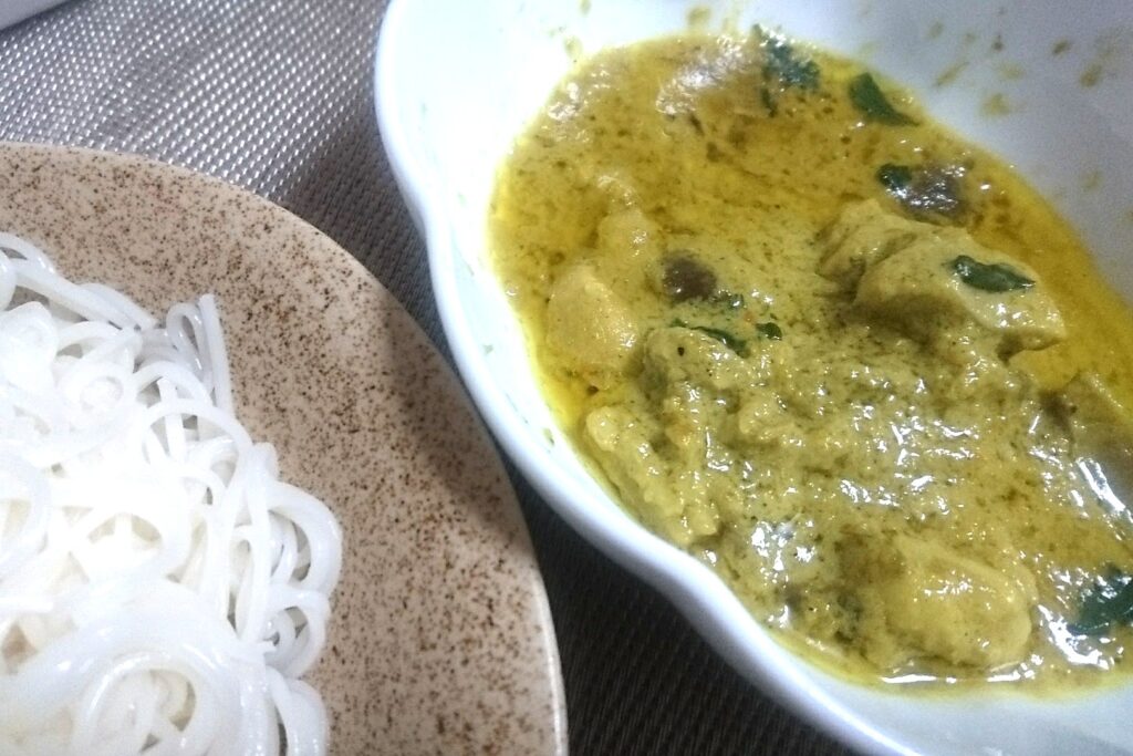 私がよく行く「メーサイストア」で教えてもらったのですが、「カノムジーン」と呼ばれる、素麺に似た発酵米麺。 これにゲーン・キヤオ・ワーンをたっぷりとをかけて、絡ませて食べます。カレーうどんは洋食のカレーと、和食のうどんを日本人が得意のアレンジで組み合わせたものですが、このカノムジーンと一緒に食べるのは、ごく普通に昔からタイでは食べられてる食べ方のようです。